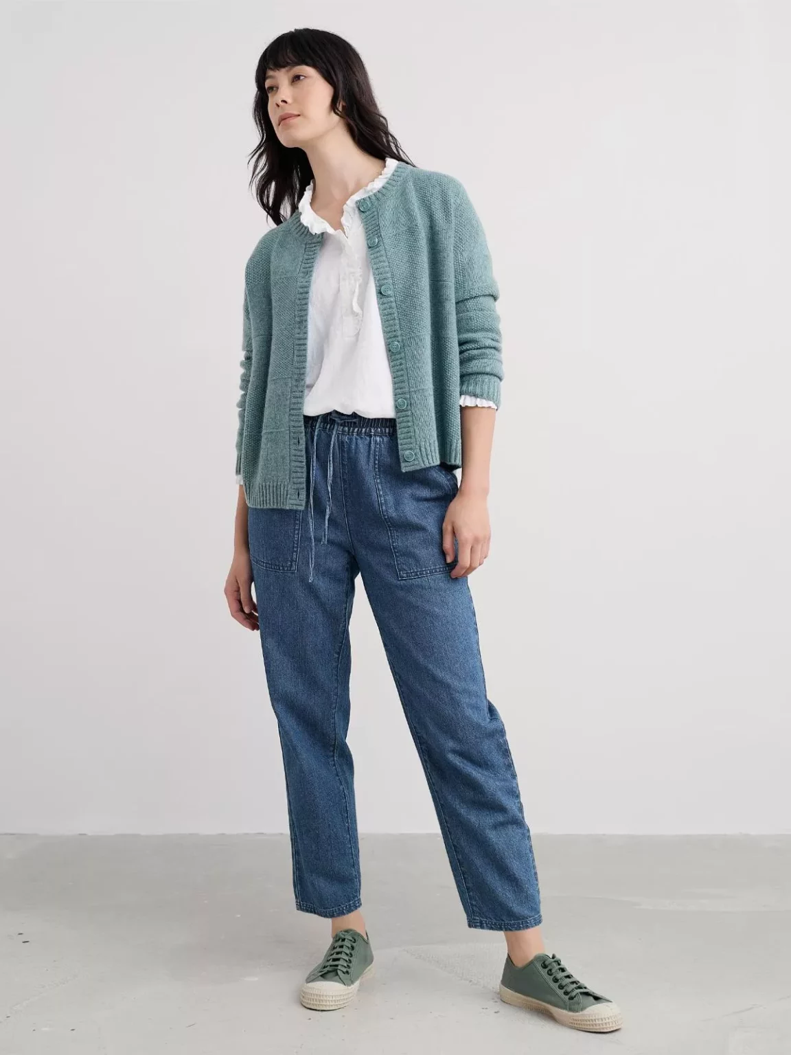 🔹 Kalhoty Sholl (Seasalt) – ležérní kalhoty z denimu s příměsí lnu, pohodlný pas na gumu, zúžené nohavice a uvolněný střih. Ve více barvách.