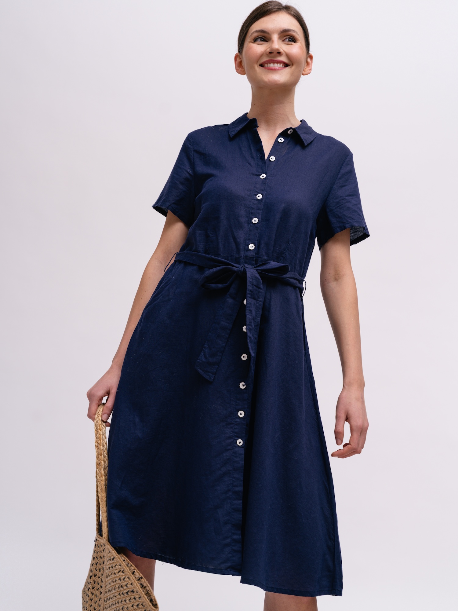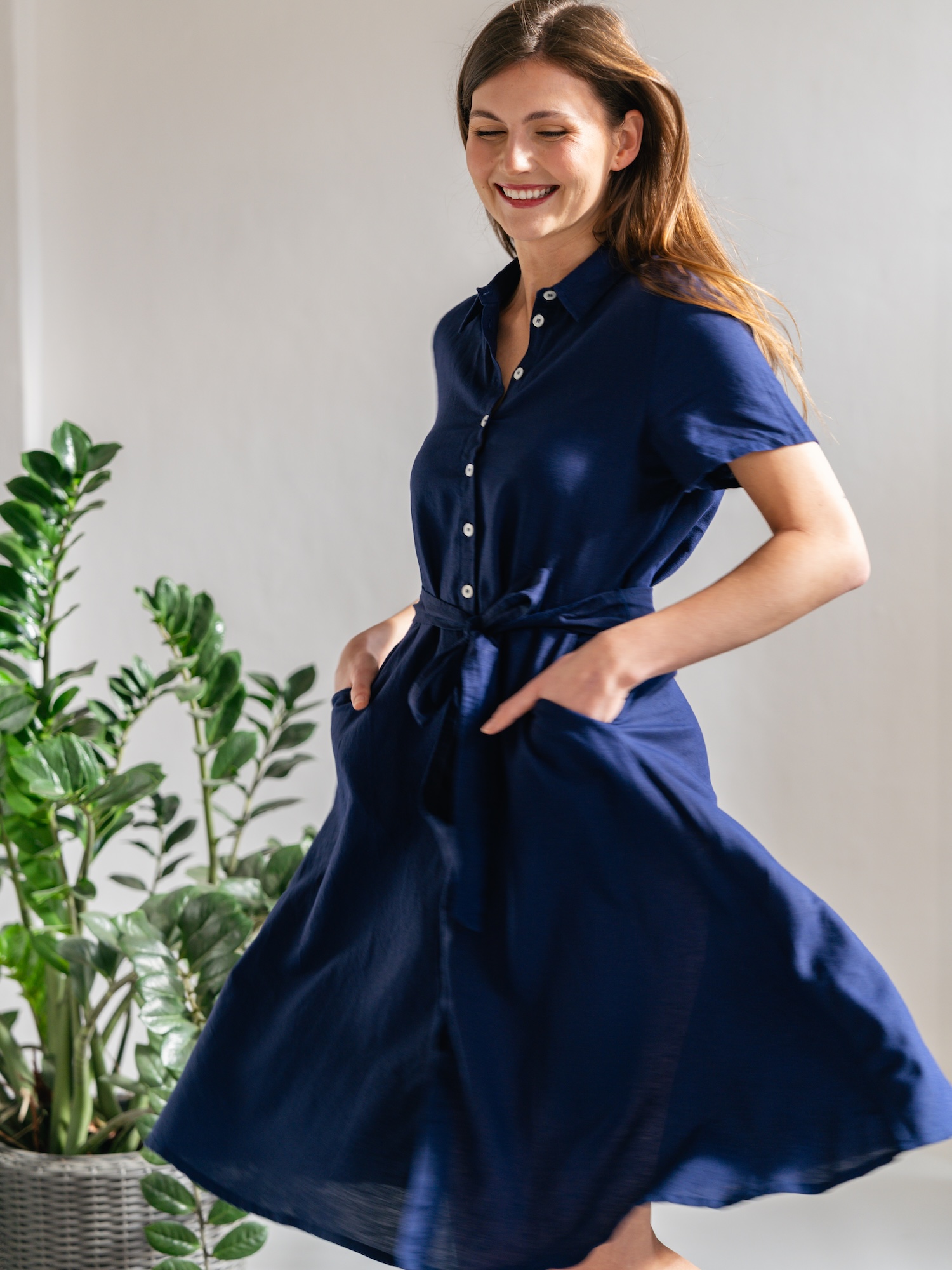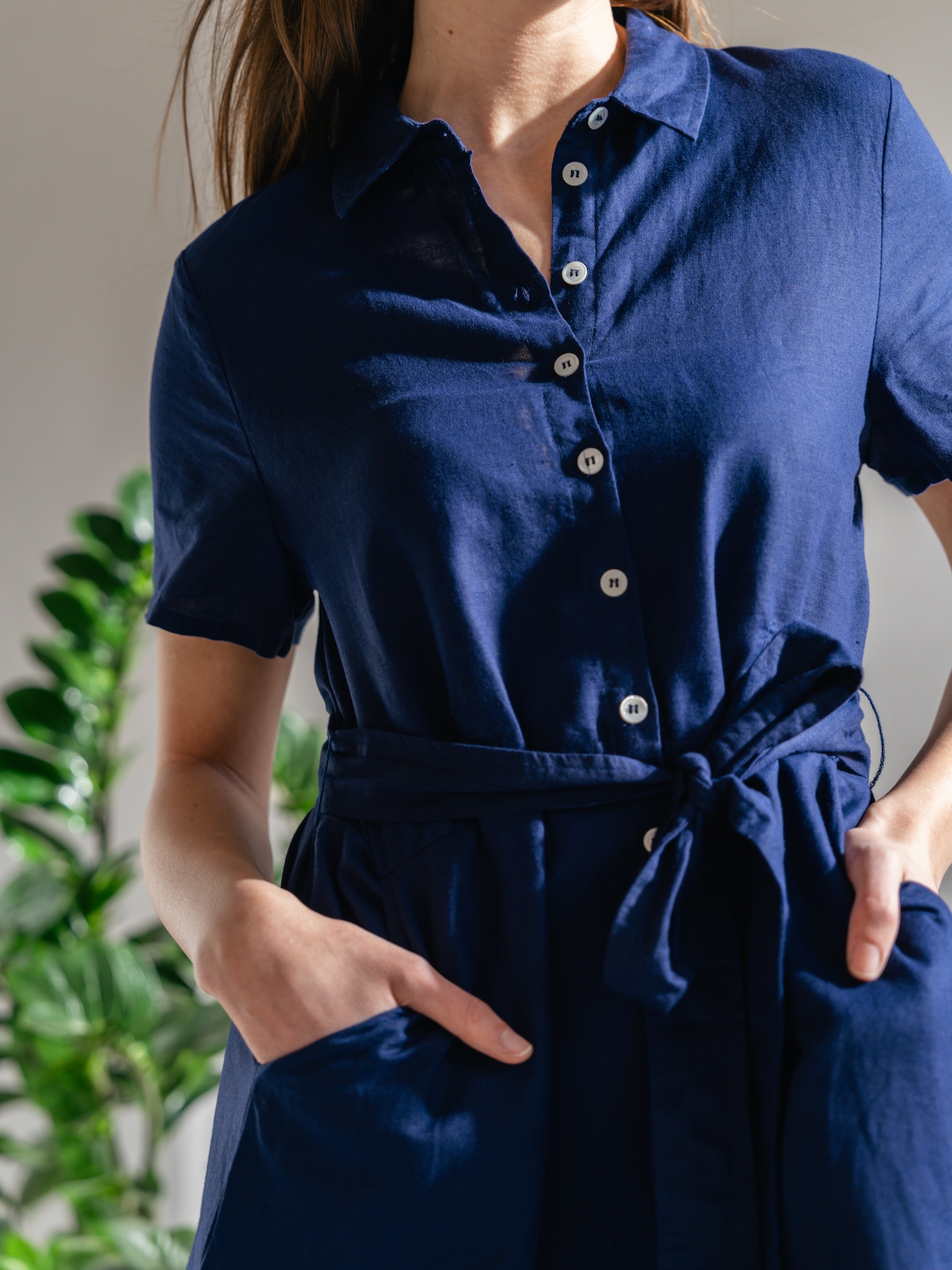 Tmavě modrá košilová varianta přinese elegantní a nenucený vzhled do pracovního šatníku. Knoflíková léga a možnost stažení v pase nabízejí variabilní styling od formálního po ležérní.