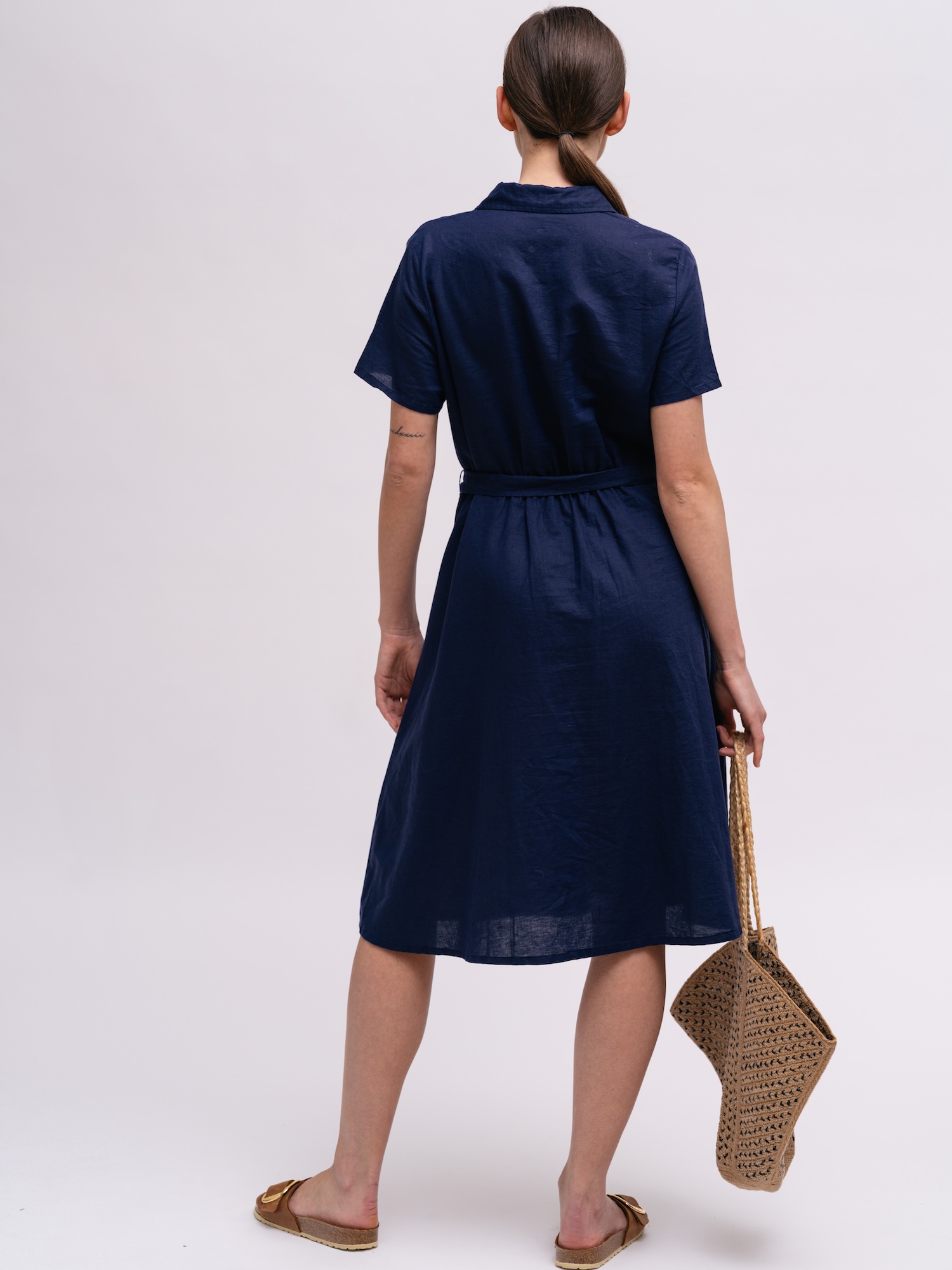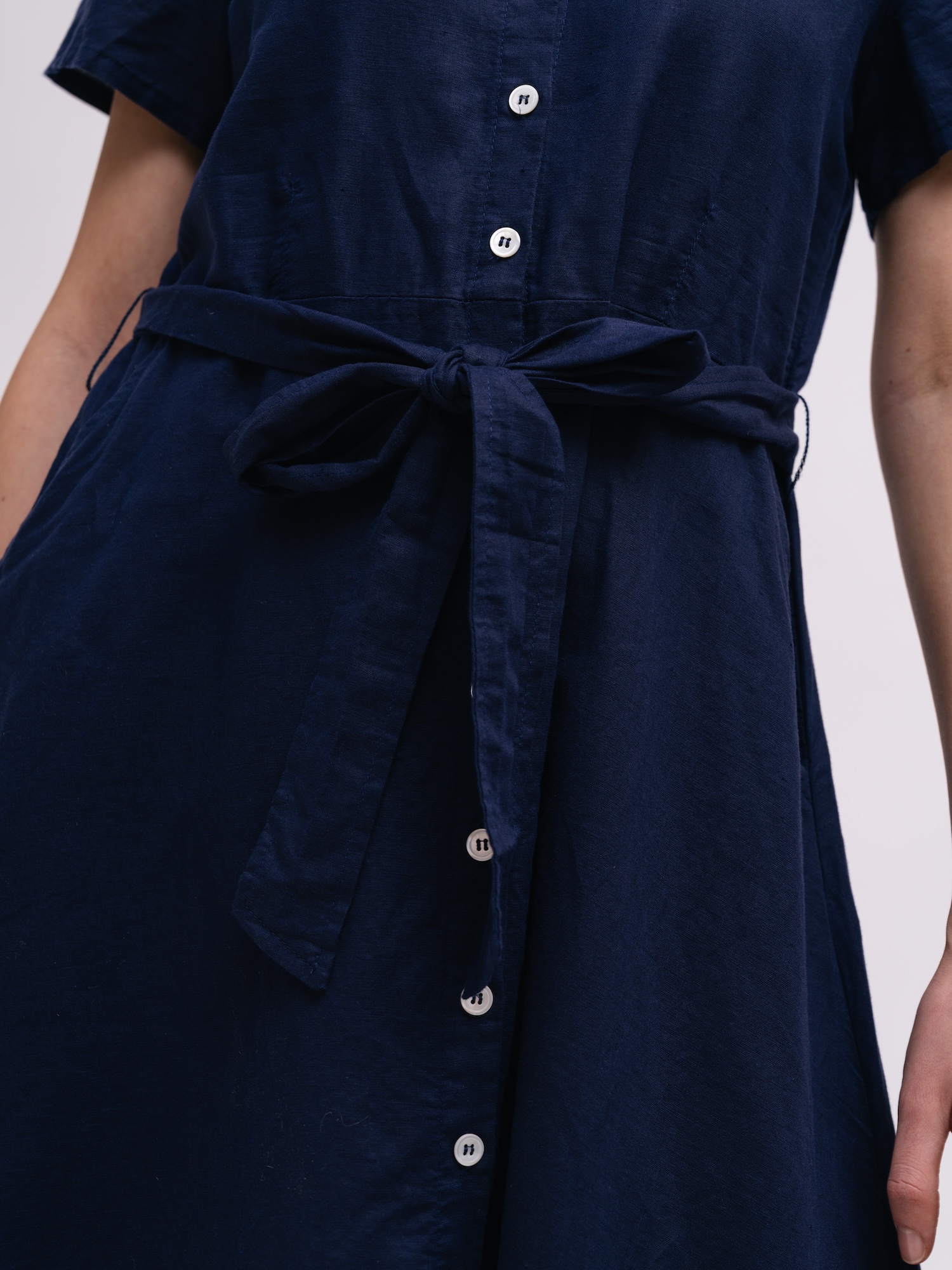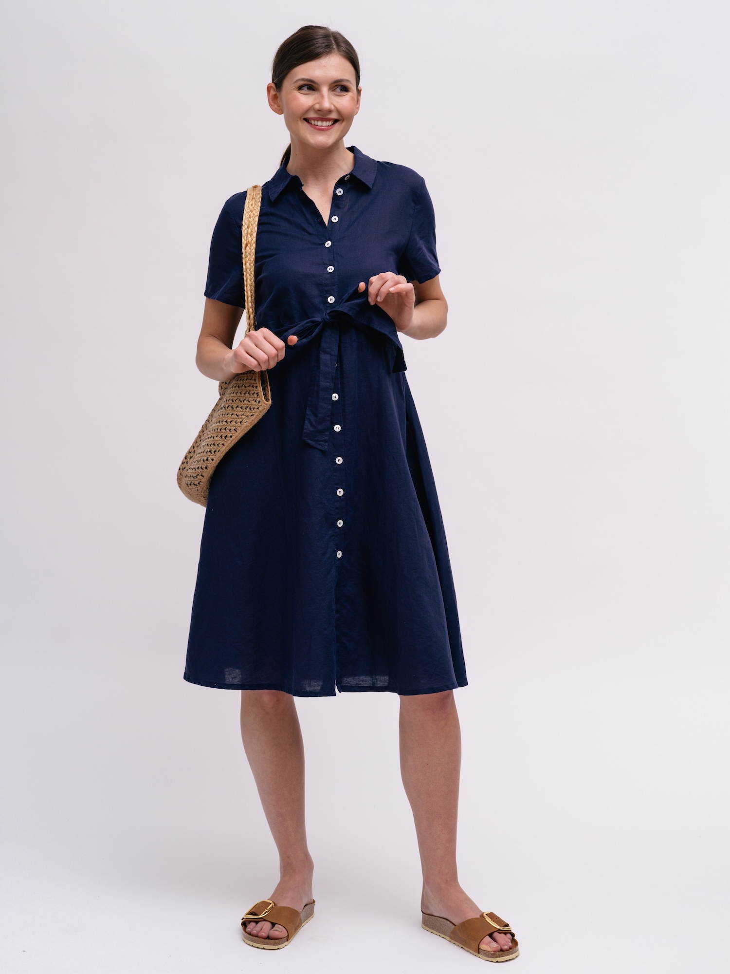 Tmavě modrá košilová varianta přinese elegantní a nenucený vzhled do pracovního šatníku. Knoflíková léga a možnost stažení v pase nabízejí variabilní styling od formálního po ležérní.