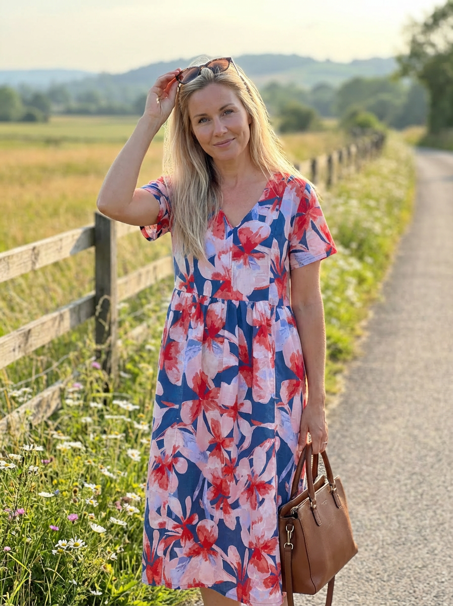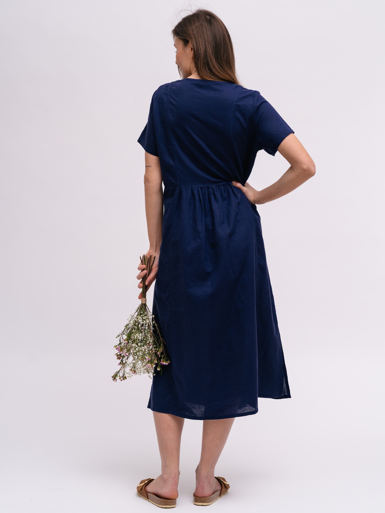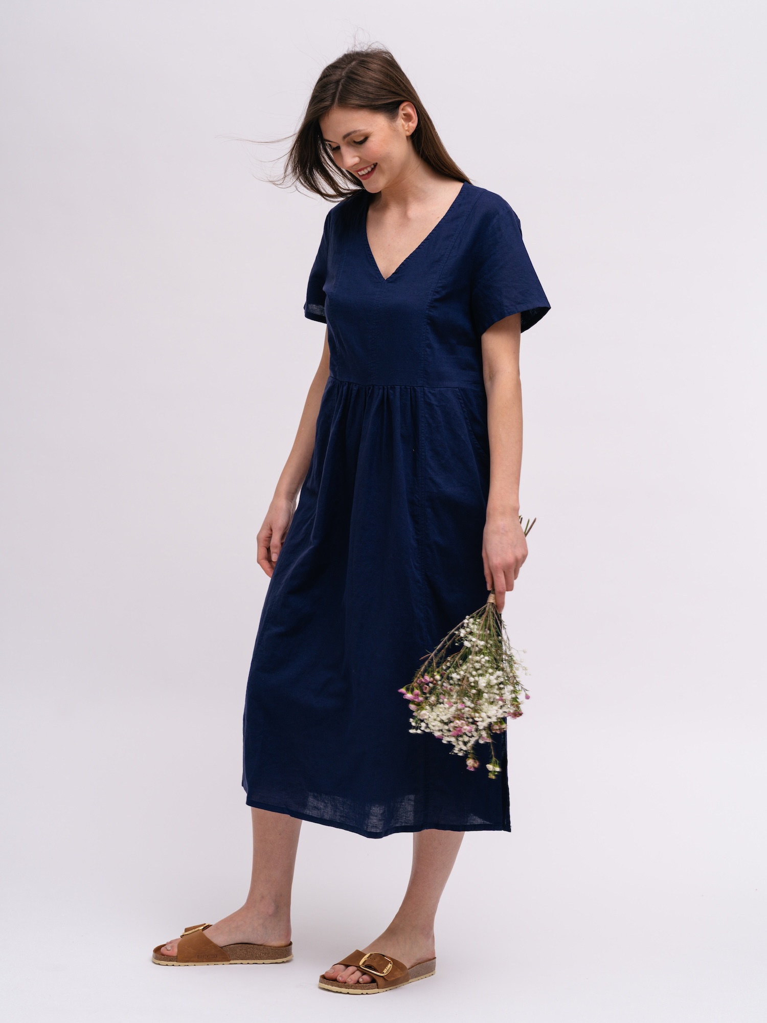 Lehké lněné šaty s výstřihem do V jsou ideální na teplé dny. Přirozená textura působí svěže na dovolené i ve městě.