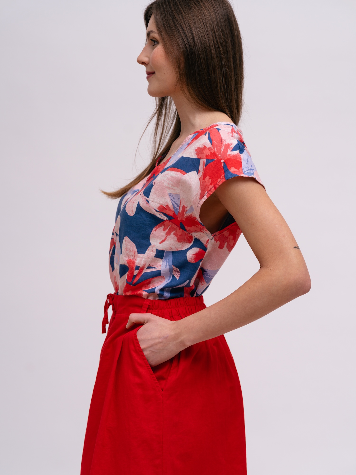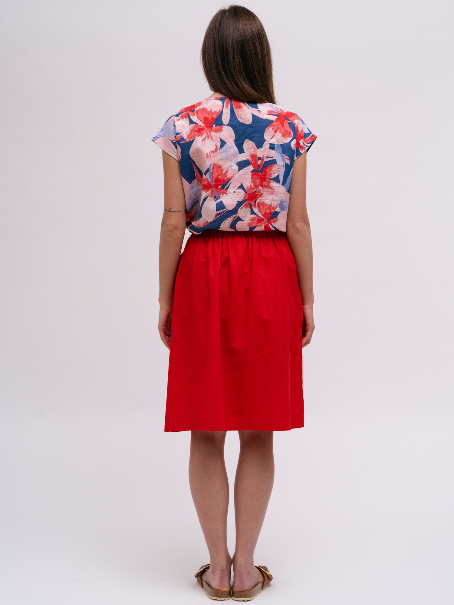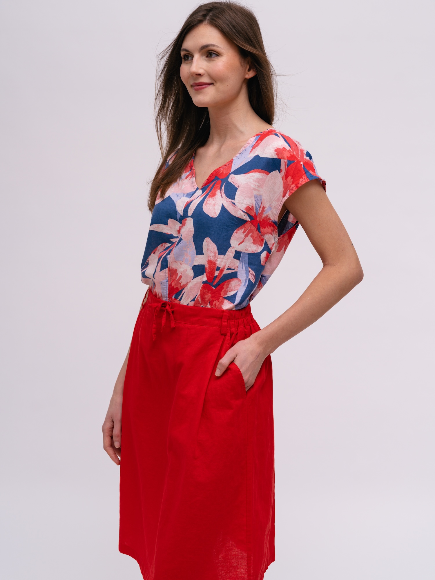 Jednoduchá červená sukně s pružným pasem nabízí každodenní pohodlí. Lehký materiál a diskrétní kapsy dělají ze sukně nenáročný základ šatníku.