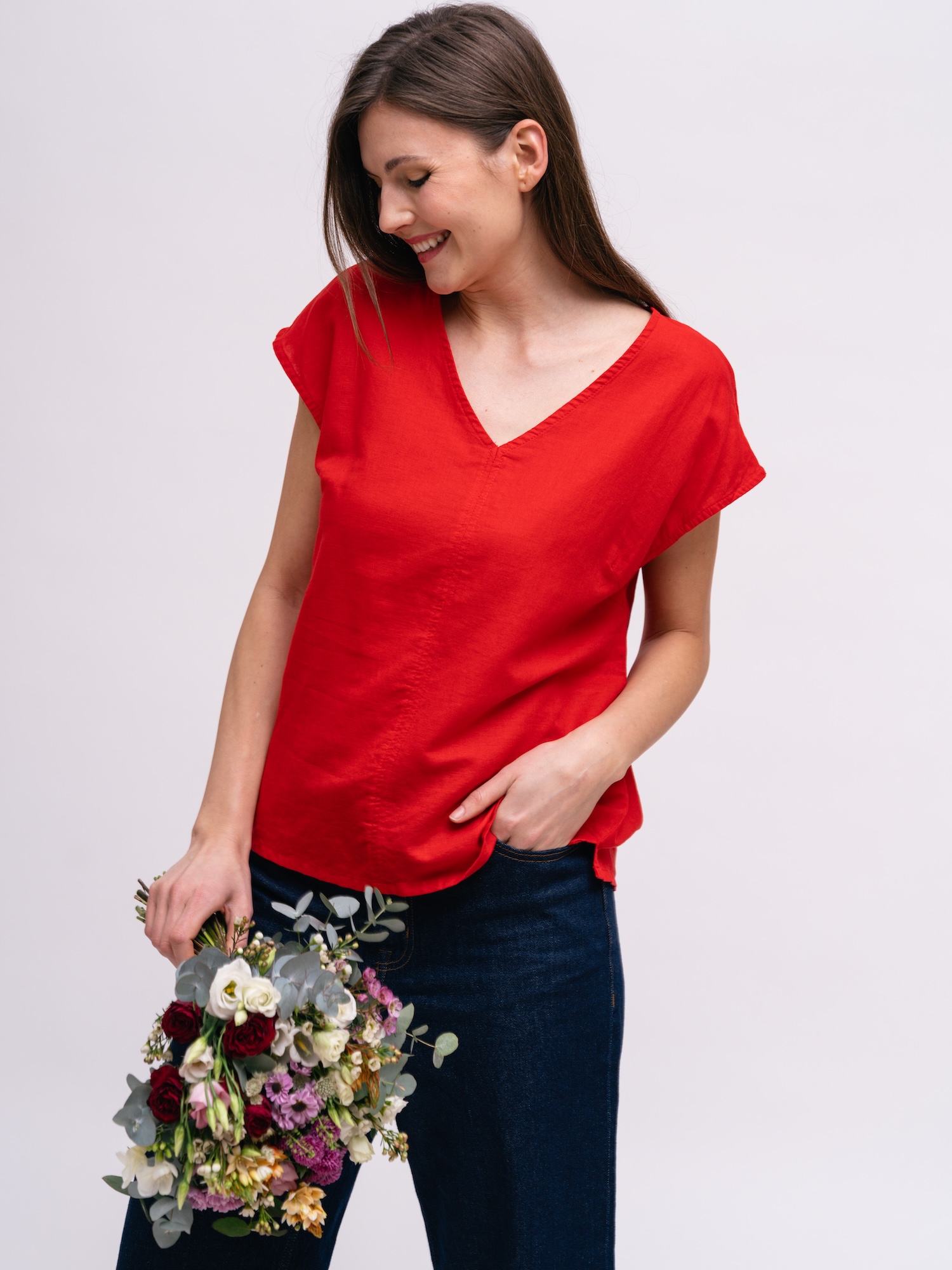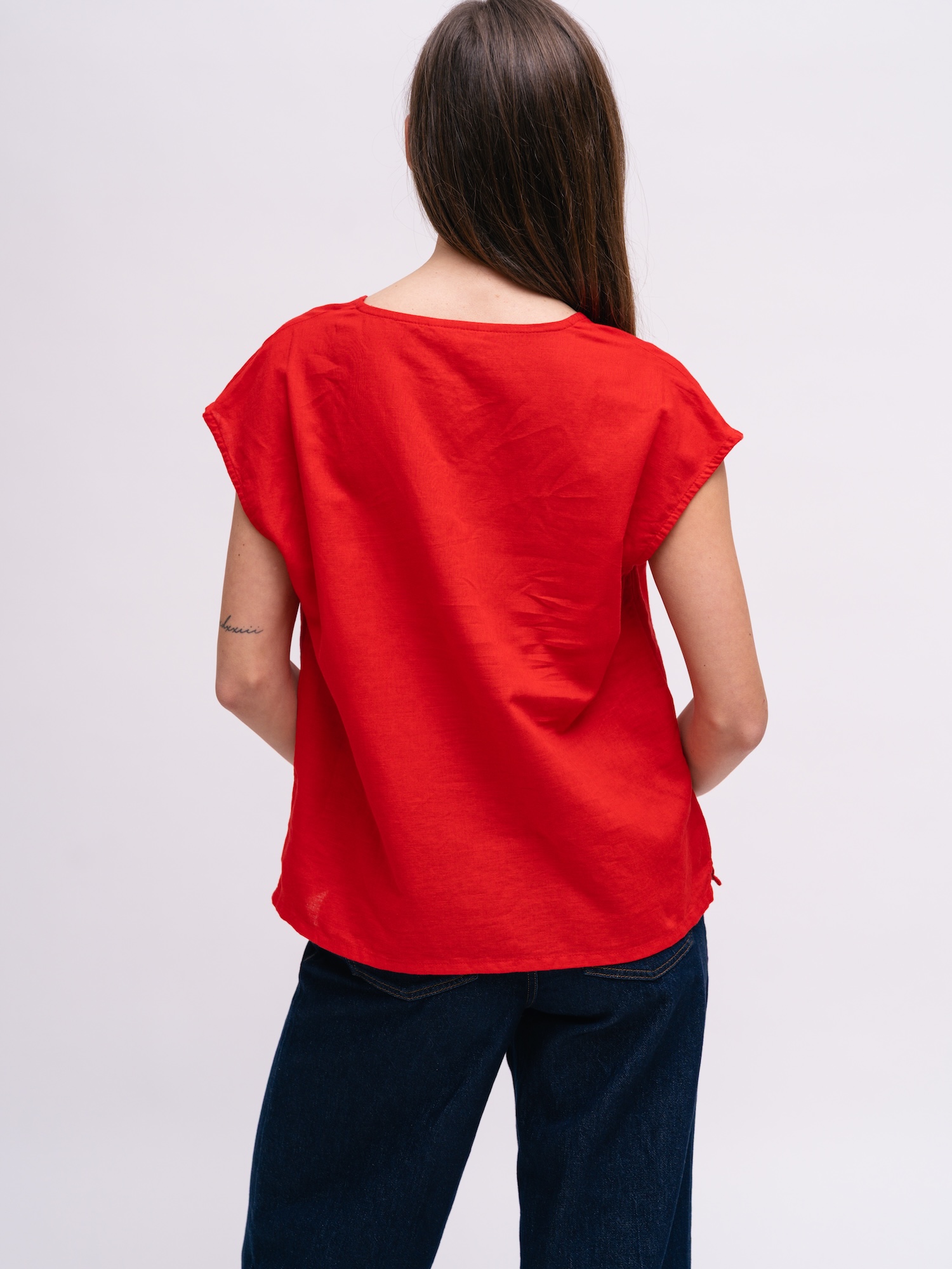 Sytě červený top v čistém střihu dodá letnímu outfitu energii. Lehký plátěný vzhled z přírodních vláken je ideální do horkých dnů.