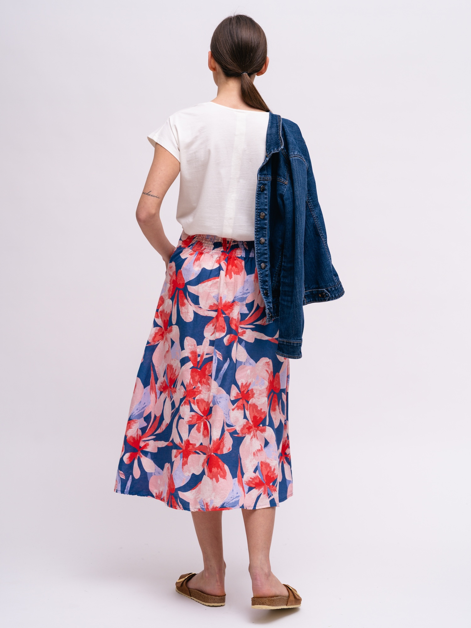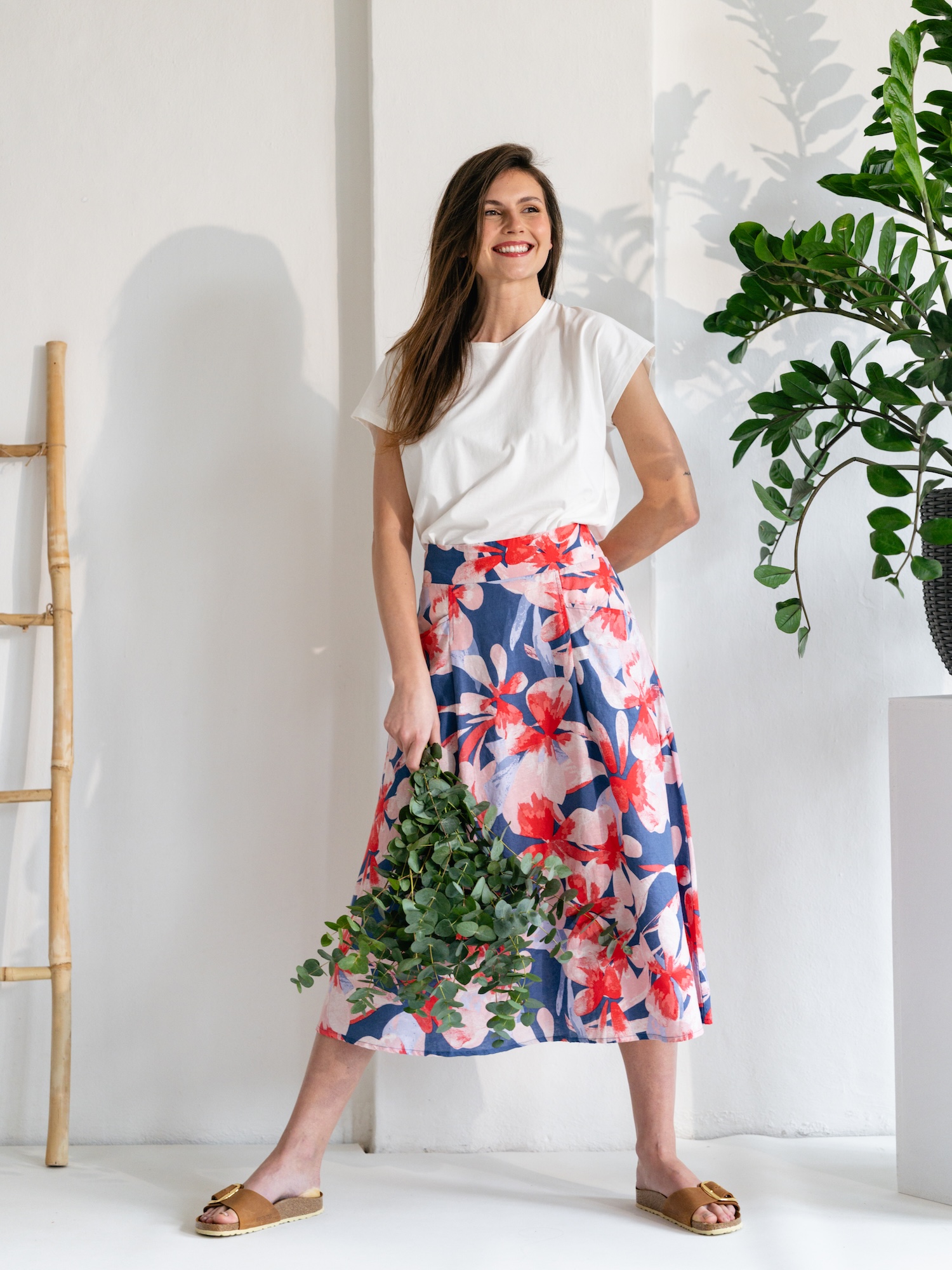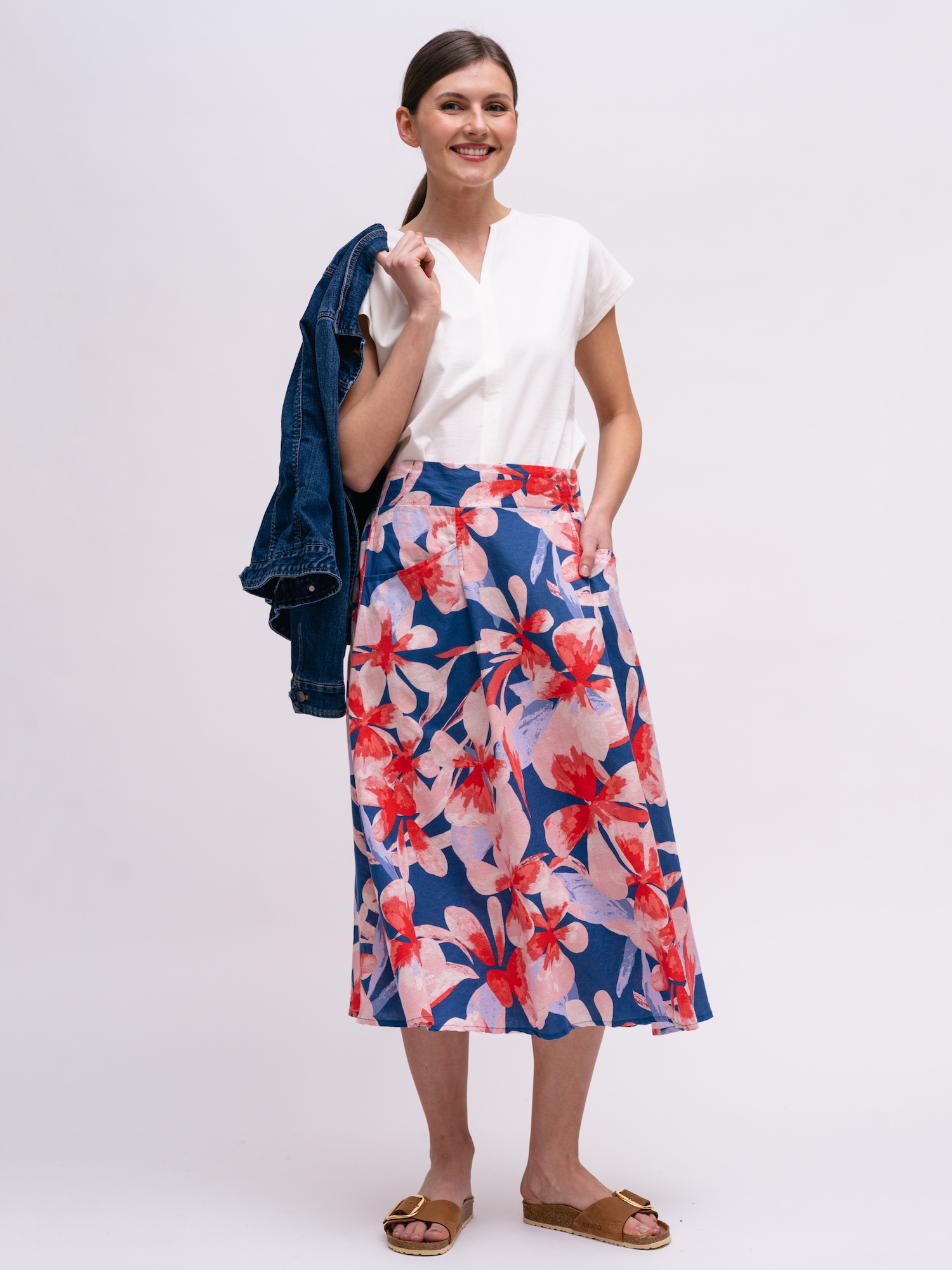 Na procházku i letní brunch se hodí květinová midi sukně v jemném áčkovém střihu. Barevný potisk na směsi lnu a bio bavlny dodává výrazný, přesto přirozený akcent.