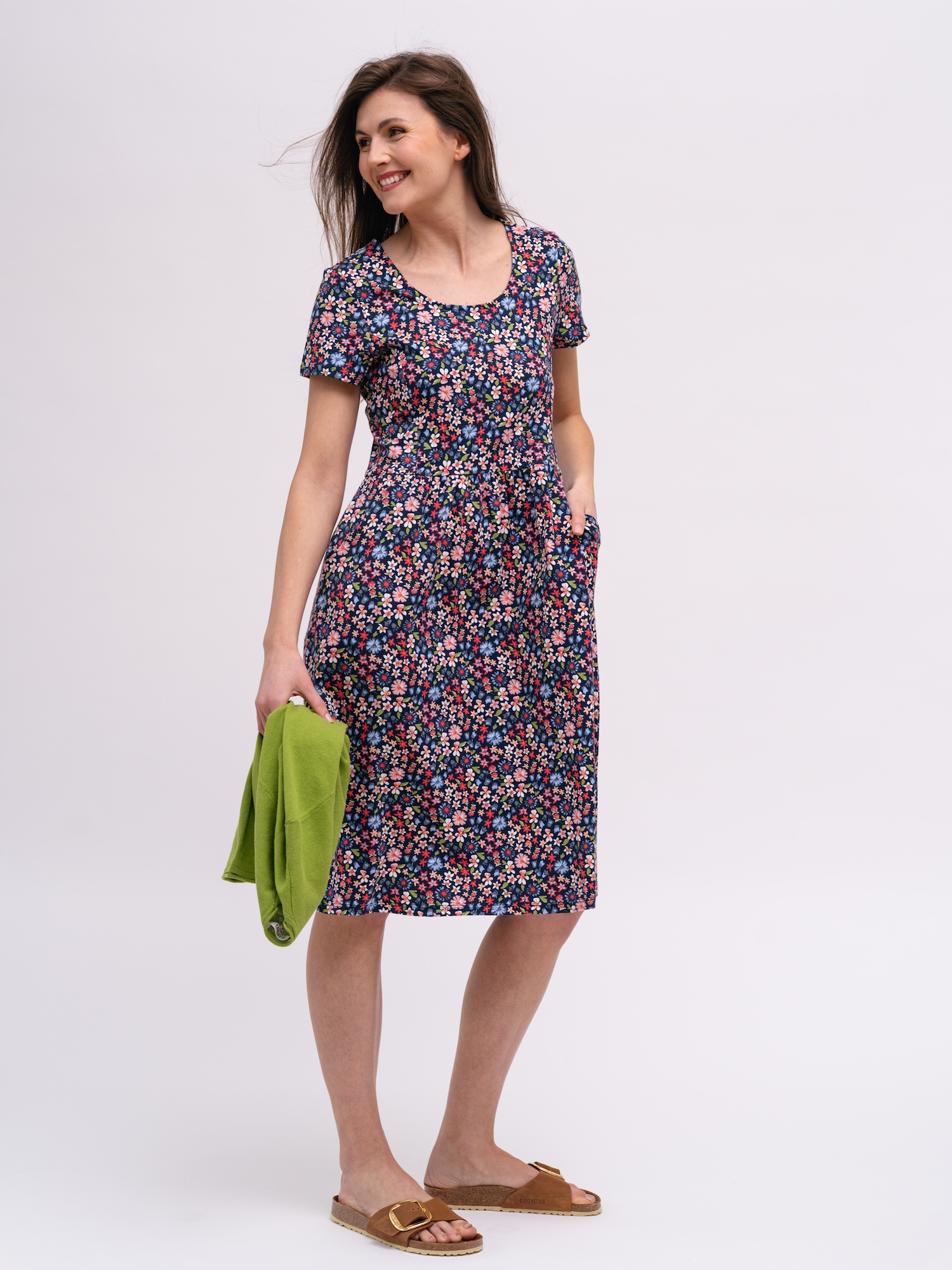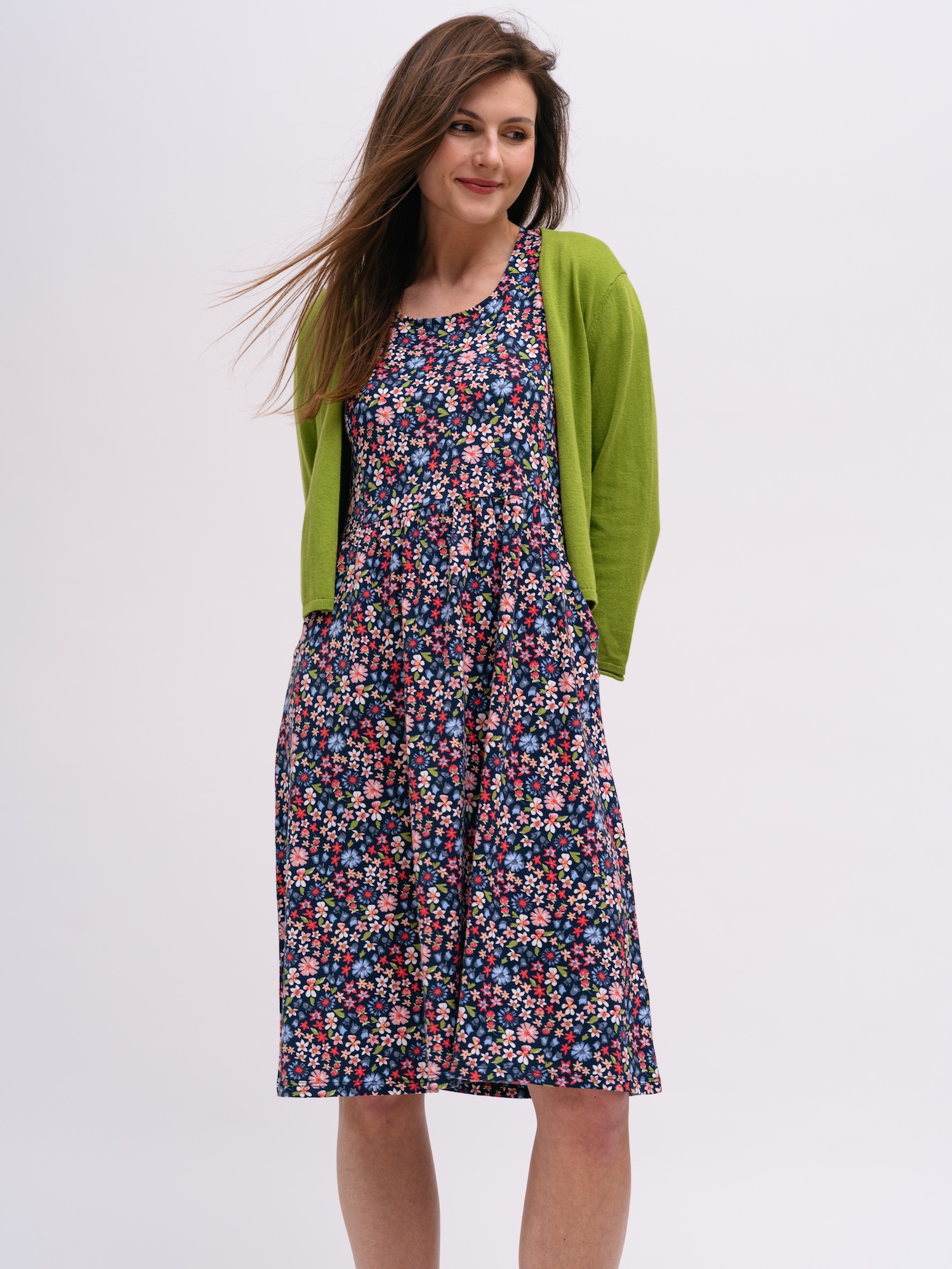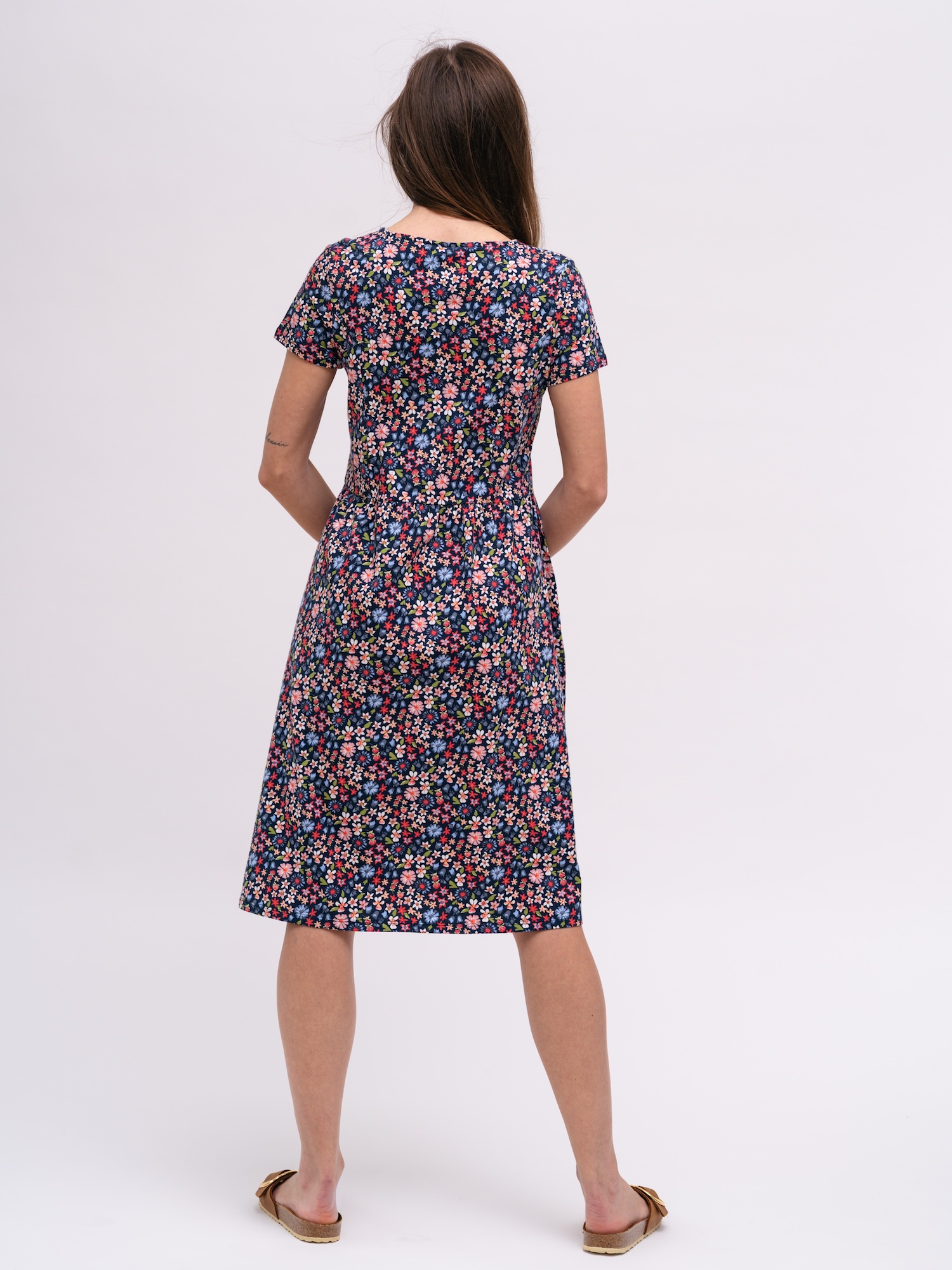 Hravý květinový vzor dodá šatům výraz bez přehnané nápadnosti. Díky jemnému žerzeji z bio bavlny a malému podílu elastanu se budete pohybovat svobodně.