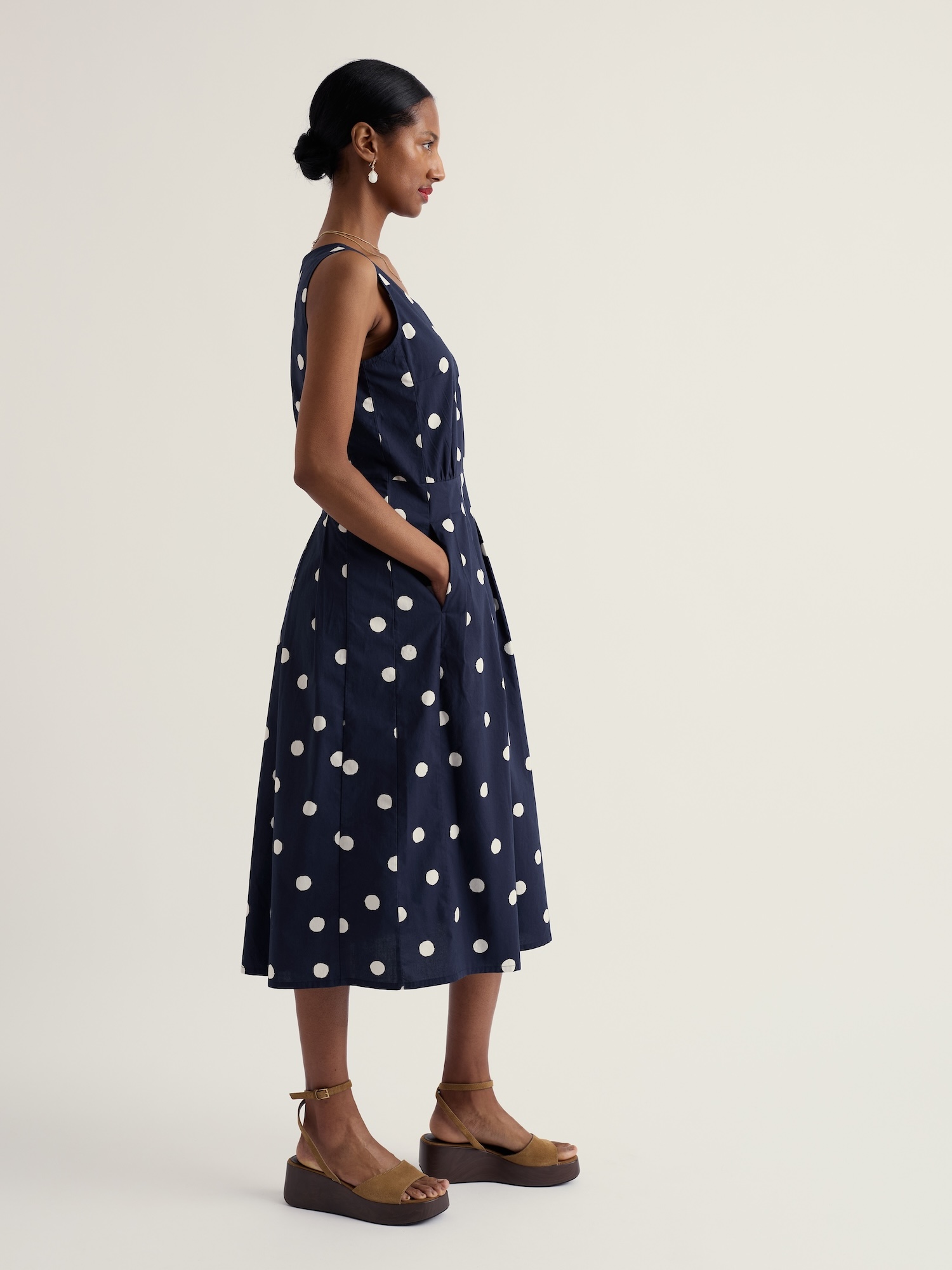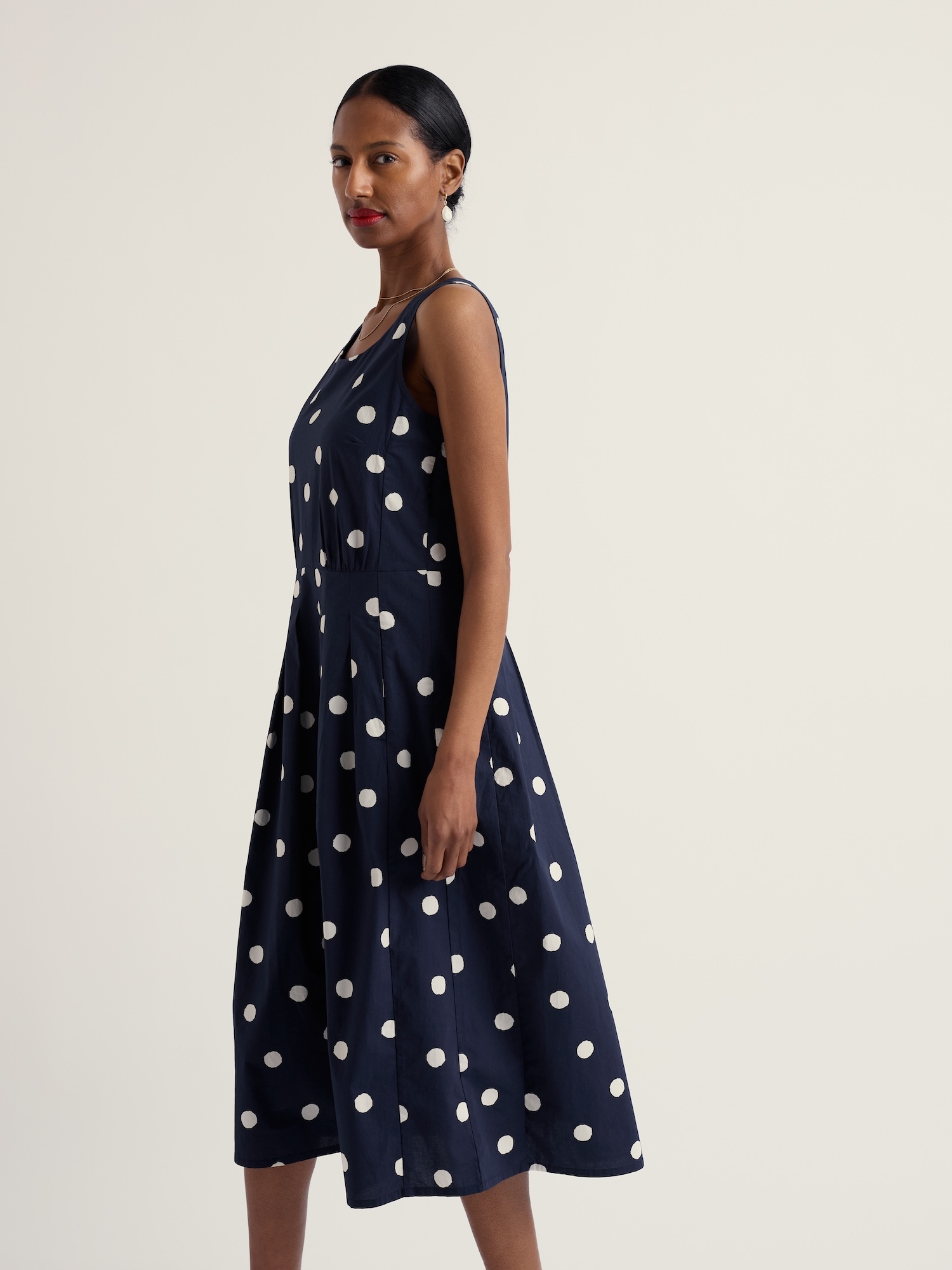 Z bio bavlny ušité puntíkované midi šaty mají čistý střih a ženskou siluetu. Díky vypasovanému pasu a bočnímu zipu vytvářejí upravený letní look vhodný do města i na zahradu.