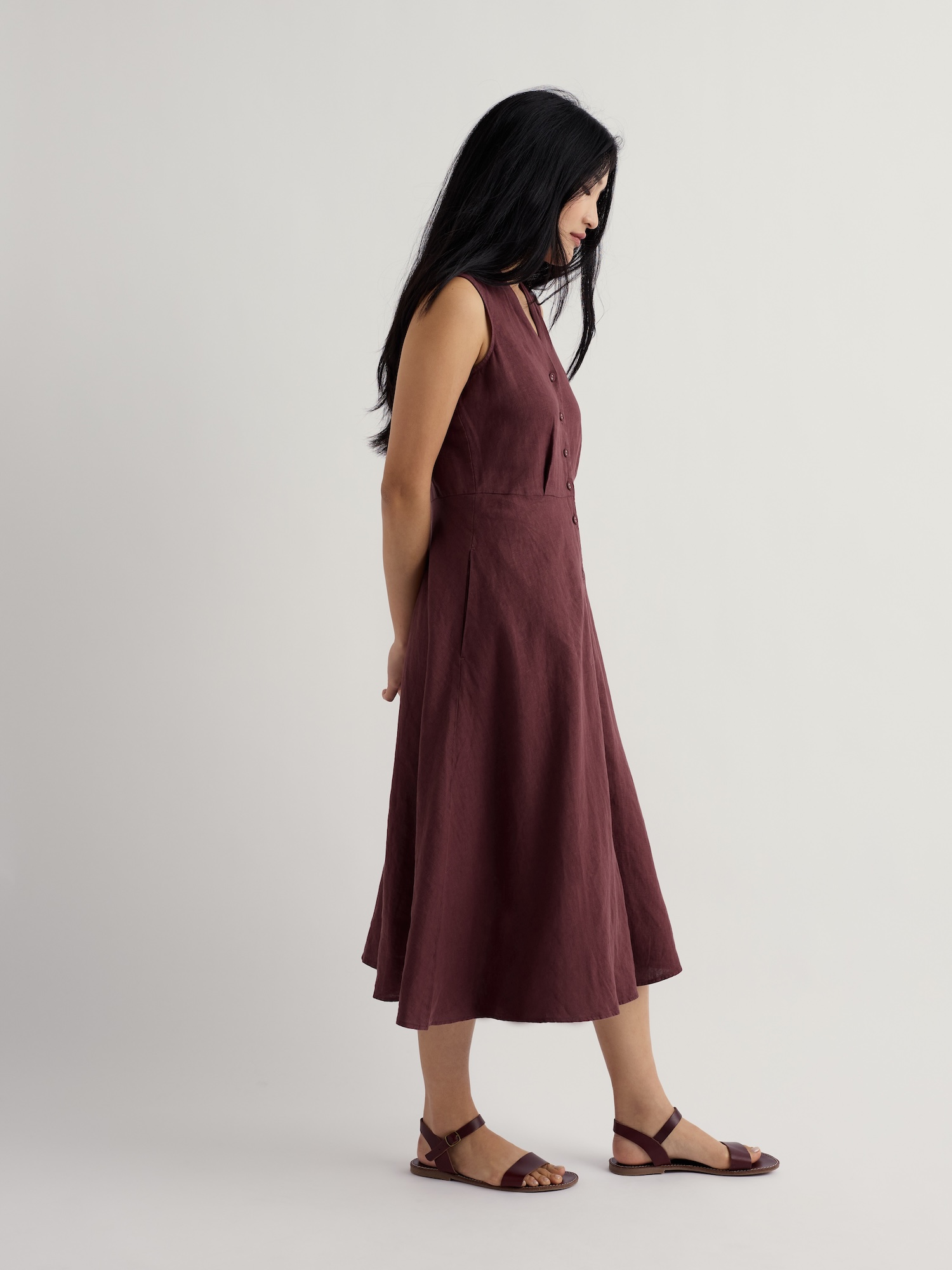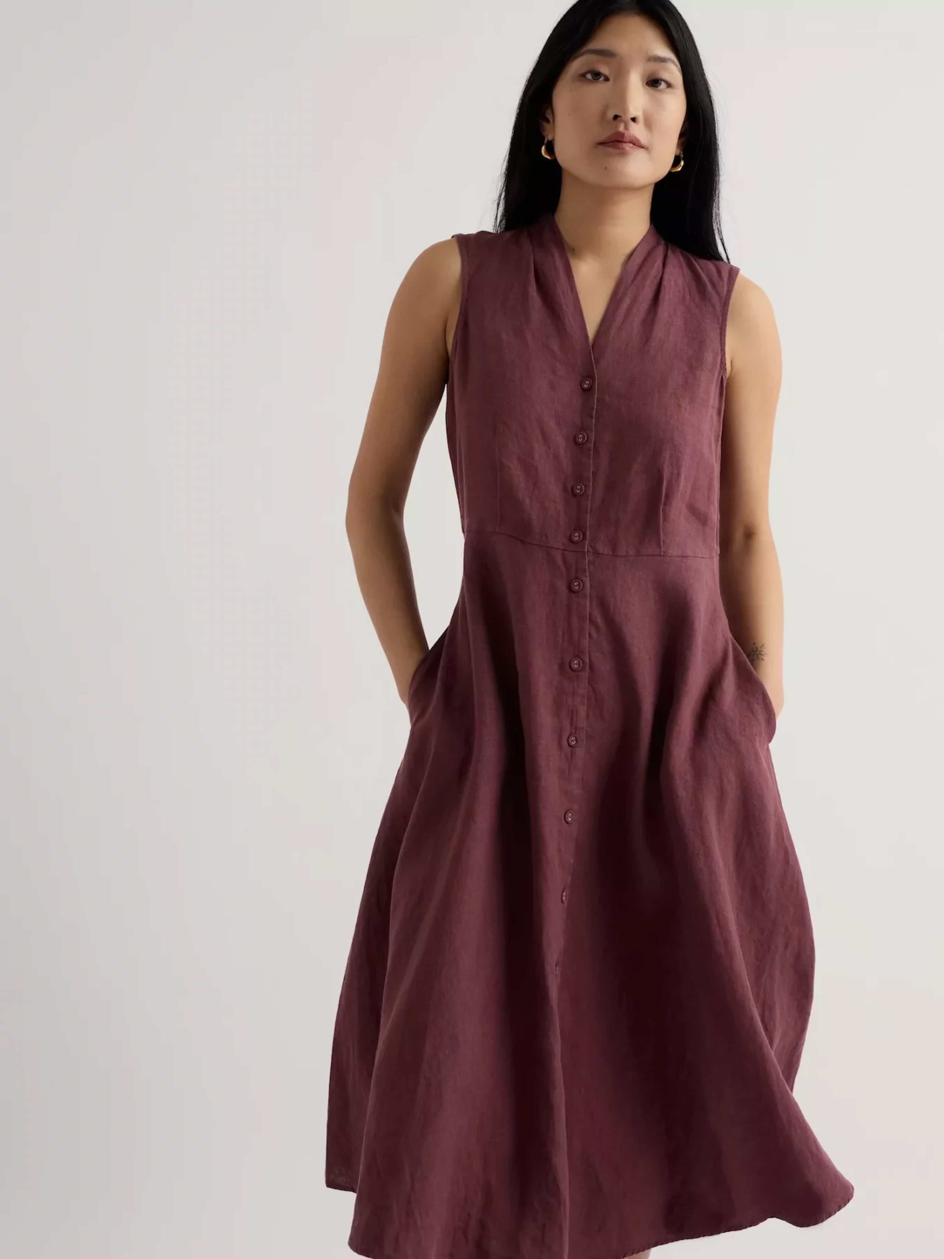 Lehké lněné šaty v áčkovém střihu nabízejí přirozený, chladivý dotek. Hodí se na výlety i do města, kde oceníte ležérní eleganci.