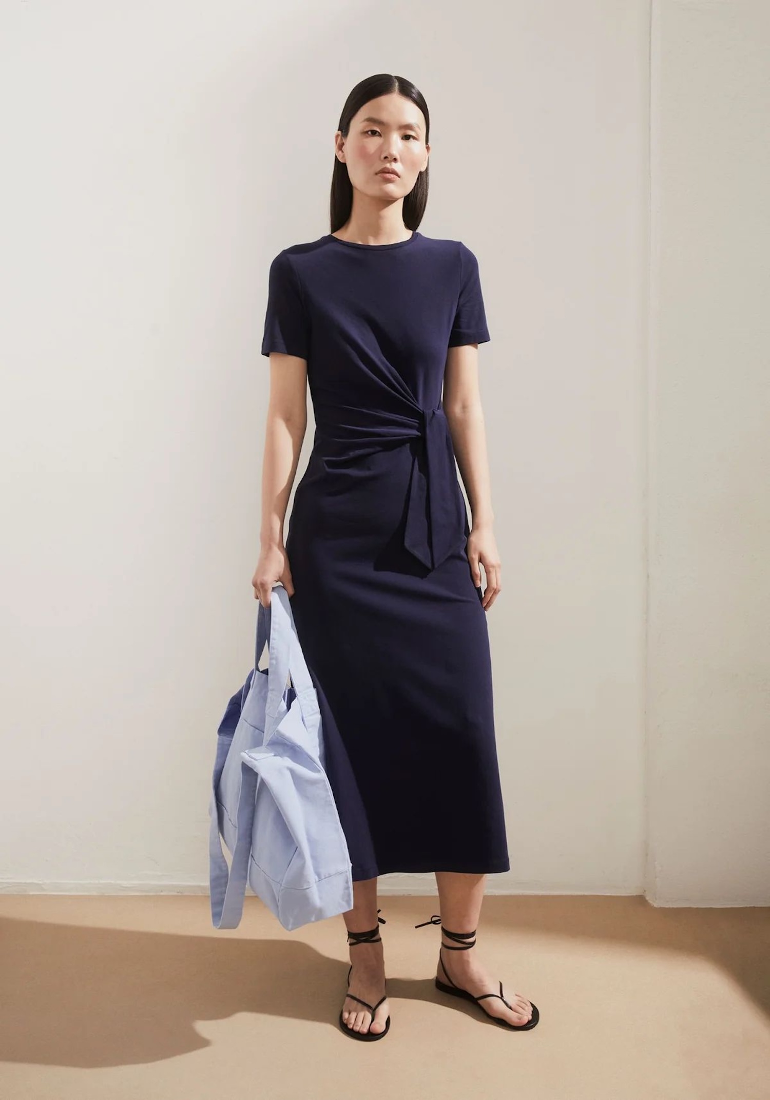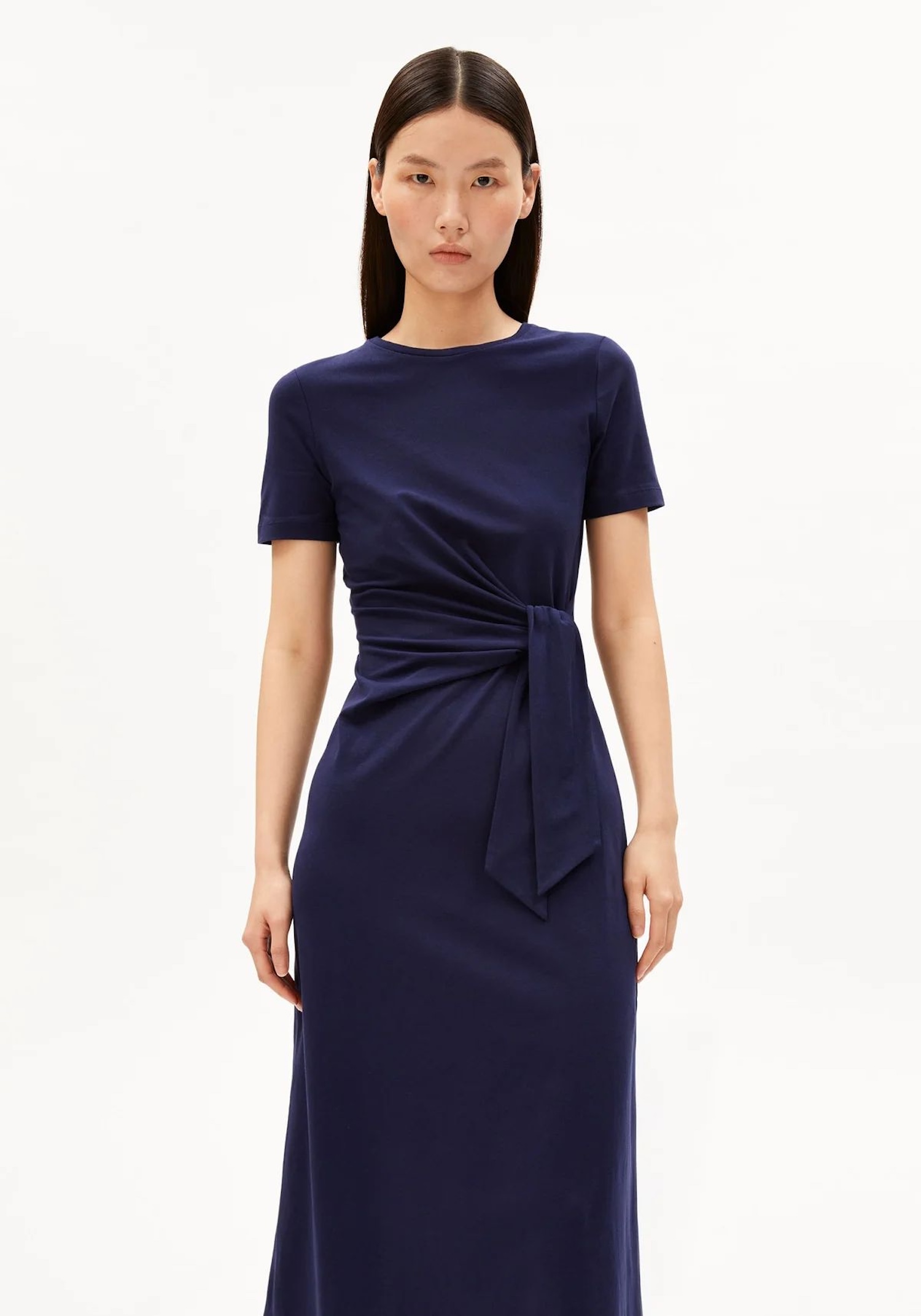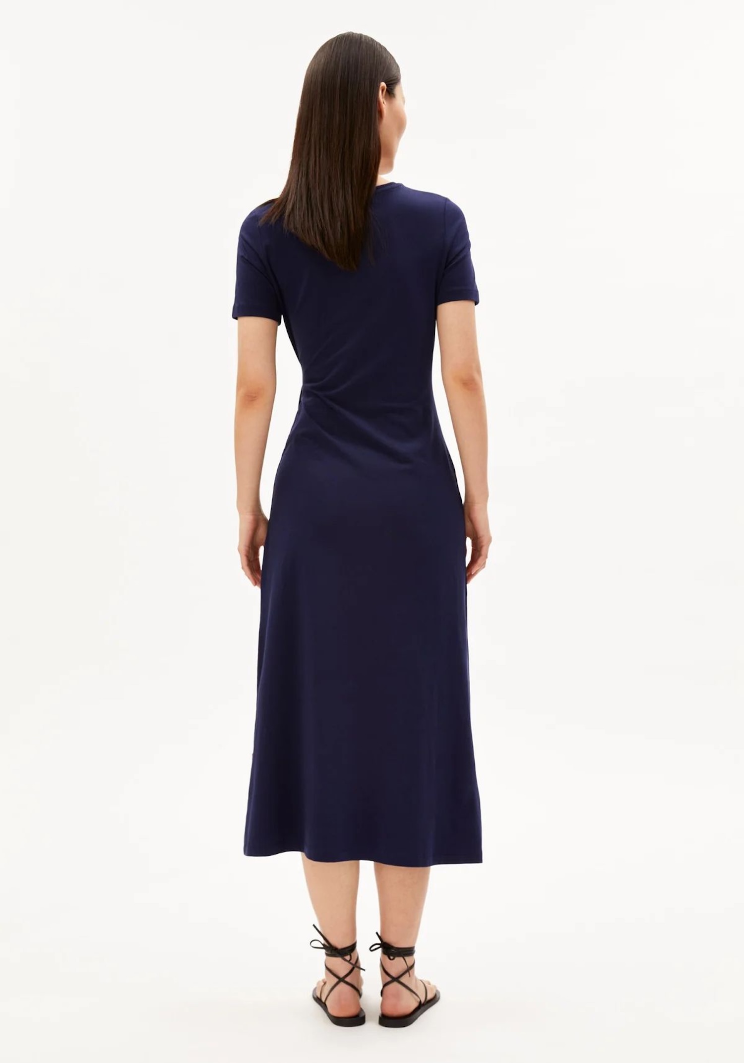 Vypasované midi šaty s kulatým výstřihem vytvoří uhlazený vzhled pro slavnostní příležitosti. Žerzej z bio bavlny je příjemný na těle a lehce se přizpůsobí konturám.