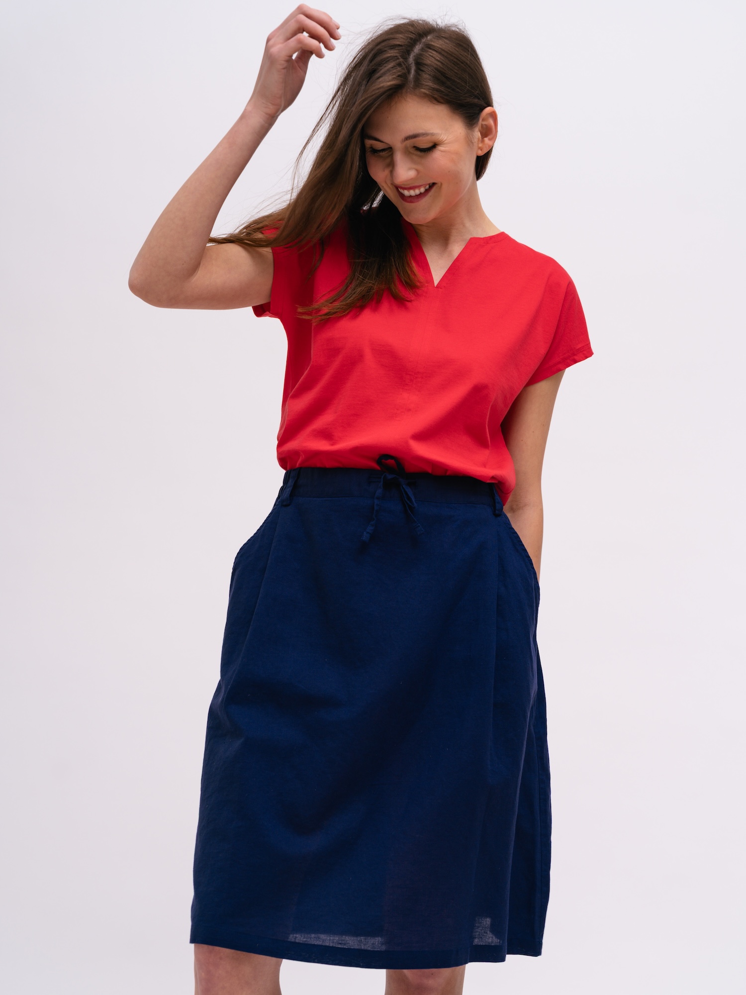 Nádherné syté barvy, skvělý střih, hodně dobře padne díky gumě vzadu, a zároveň vpředu je oblast pasu rovná, takže to vypadá moc dobře. Materiál je tenčí, než jsem čekala, ale na léto bude dokonalá.