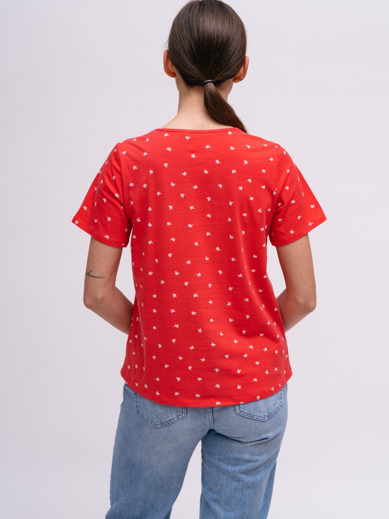 Hledáte tričko s jemným květinovým vzorem do každodenního šatníku? Směs modalu a bio bavlny zajišťuje hladký povrch a přirozený splývavý efekt.